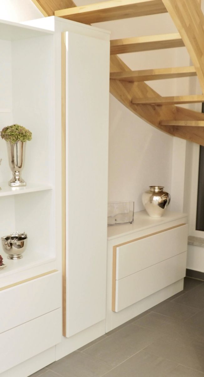 Schrank für Geschirr aus feinem Weißlack mit Buchenholz Applikationen